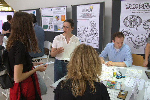 Next to the programme at the city center, also the St. Pölten UAS campus turned into the place to be for science-interested visitors. On 21 May, an interactive Science Fair made it possible for anyone interested to find out more about the research done in Lower Austria and beyond, with booths covering topics like vertical indoor farming, dietary choices for maintaining healthy joints, or bringing data to life. A well-visited science communication workshop, titled "Public Engagement with Science", taught participants how to communicate complex and sometimes hard to understand scientific topics to a broad audience in a fun, easy-to-grasp way. Various tours through the St. Pölten UAS labs, such as the rail lab, the audio lab, the TV studio or the health labs, as well as a research speeddating session, provided a varied programme for the visitors. In the evening, a Science Pub Quiz invited attendees to test their knowledge in a competitive but fun setting, as the St. Pölten UAS cinema turned into the stage for quiz hosts Ramona and Alex. Enjoying free drinks and various rounds of questions, the winning team got to take home hand-crafted and upcycled bags provided by the E³UDRES² Ent-r-e-novators team.