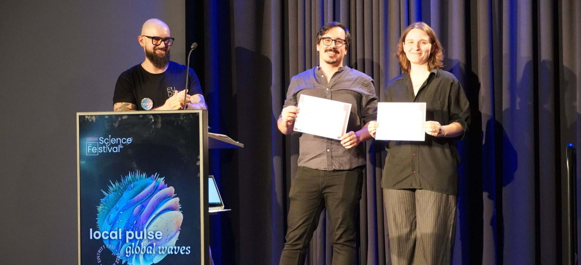 Award Ceremony host Alex Xafis with Felix Blasinger and Tanja Ploner as they receive their certificates for second place in the "Innovative Science Outreach" category. (c) Eva Nikolopoulou