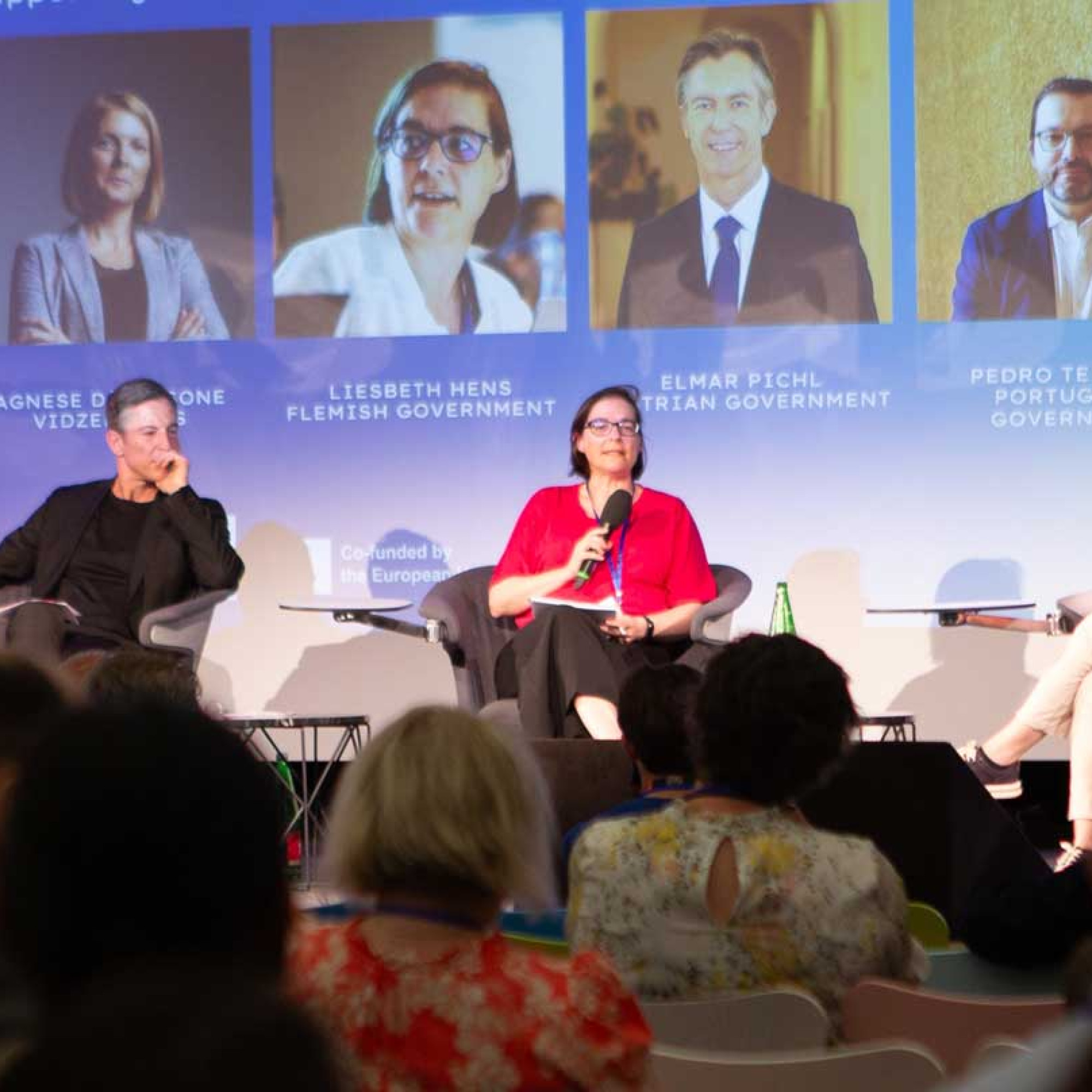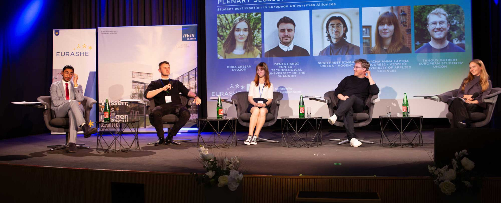 Karina Anna Lapina (center) discussing the topic of student participation in European University Alliances on a panel. Picture: (c) Sandra Lagler
