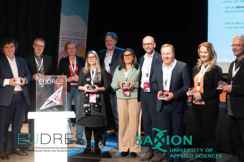 The E³UDRES² Spring Summit 2025 was a great platform for building international cooperation, enhancing university-industry partnerships, and promoting sustainable regional innovation. Discussions centered on how universities can adapt to future needs, collaborate more closely with industries, and create solutions that drive both social and economic growth. Deep-tech innovations were central to discussions on regional resilience and sustainability, with numerous breakthroughs presented during the summit. As a powerful symbol of growth, unity, and the role of smart technology in regional development, the central theme of the summit was embodied in the unveiling of a E³UDRES² plaque. This commemorative plaque, now permanently displayed at Saxion University of Applied Sciences, serves as a lasting reminder of the collaborative spirit and innovative efforts that defined the summit. The E³UDRES² team looks forward to seeing how the ideas, collaborations, and discussions from this summit will translate into real-world actions and solutions.